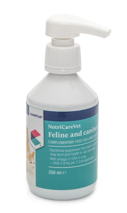 Pienso complementario para perros y gatos de la marca Covetrus. Este suplemento nutricional está específicamente formulado para promover la salud articular a largo plazo en los perros, ayudando en casos de rigidez articular general, rigidez en las patas delanteras o traseras, inmovilidad en perros de edad avanzada y cojera.