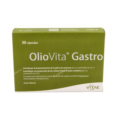 Indicaciones: OlioVita® Gastro es un complemento alimenticio a base de Aceite de Espino amarillo y Betaglucanos. Los betaglucanos contribuyen al normal funcionamiento del tracto gastrointestinal. El aceite de espino amarillo confiere propiedades hidratantes y nutritivas de utilidad para la mucosa y el sistema inmune gracias a su contenido en flavonoides. Contribuye al normal mantenimiento de piel y mucosas por su contenido en vitamina A. Ayuda a la protección de las células contra el daño oxidativo por su contenido en vitamina E.