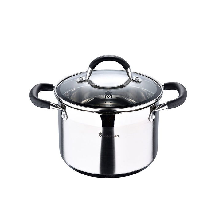 Olla ø20x14cm 4l acero inoxidable con tapa foodies bgmp-1505-bk masterpro. esta olla de masterpro foodies mide ø20x14cm y tiene capacidad de 4l. está fabricada en acero inoxidable, 18/10 color gris, con calidad de doble acabado mate/brillante de aspecto elegante, profesional y de alto rendimiento. gracias a su buen diseño, estructura y materiales, esta olla es la adecuada para las cocciones más exigentes, apta para inducción. incluye una tapa de cristal que permite mirar el proceso de cocción de los alimentos, sin necesidad de estar destapando la olla. otra de las ventajas de este artículo es que su tapa está equipada con doble escurridor de agua. esto hace que no sea necesario utilizar coladores para cocinar y ayuda a ahorrar tiempo en la cocina, para al recoger y limpiar. el revestimiento de silicona negra le va muy bien a cada mango y asa, y es un detalle más de seguridad y belleza de la olla. en el interior hay un práctico medidor que evita errores en el cálculo de tiempo.