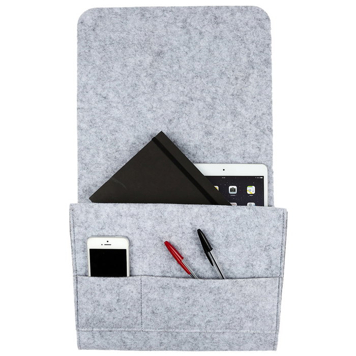 - Carpeta de bolsillos cuya solapa superior se coloca bajo el colchón de manera que el resto del artículo queda colgado en el lateral de la cama; esto permite almacenar objetos como