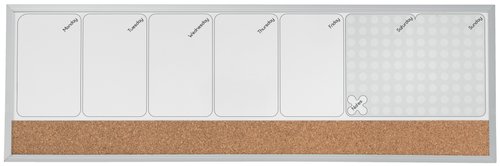 Planificador semanal mixto con marco de aluminio. Una parte con pizarra magnética de borrado en seco, para tomar notas para cada día de la semana, y otra parte de corcho para utilizar como tablero de anuncios: fijar notas y anuncios. Se suministra con un rotulador para pizarra con un borrador en la tapa, almohadillas adhesivas e imanes de montaje. Medidas: 188 x 597 x 15 mm.