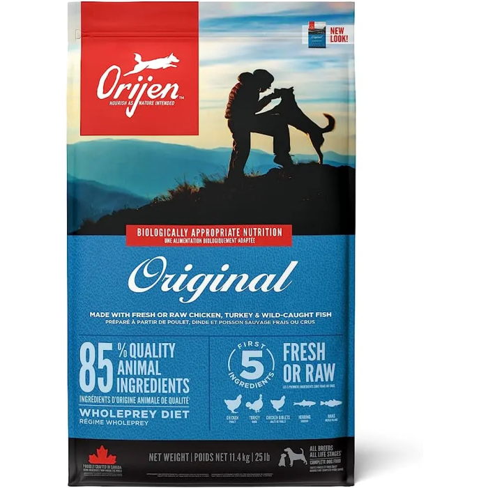 Inspirado en la dieta natural de los lobos, ORIJEN Original reproduce la riqueza y variedad de ingredientes animales enteros que todos los perros necesitan para una salud óptima.