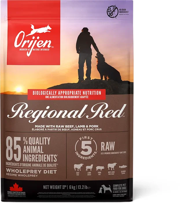 ORIJEN Regional Red ofrece una alimentación inspirada en la dieta ancestral de los perros, que consumían la presa completa, incluyendo carne, órganos, cartílago y huesos. Esta receta proporciona los nutrientes naturales que necesitan. Se elabora con un 38% de proteínas procedentes de ingredientes animales de alta calidad, como ternera criada en libertad, jabalí, bisonte, cordero alimentado en pasto, cerdo Yorkshire y sardina del Pacífico capturada de forma natural. La fórmula incluye 2/3 de ingredientes animales frescos o crudos y 1/3 deshidratados, lo que aporta una fuente concentrada de proteínas. Es una dieta completa y equilibrada para perros de todas las razas y edades.