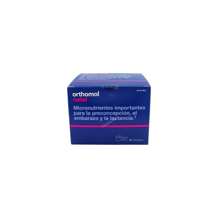 Indicaciones: Contiene importantes nutrientes tanto para el desarrollo del niño y el bienestar de la madre durante el embarazo y la lactancia como para mujeres que desean tener un hijo. Contiene una combinación de ácido fólico y Quatrefolic. Quatrefolic es una forma activa de ácido fólico, que está disponible para el cuerpo sin conversión previa y por lo tanto tiene una mayor biodisponibilidad. Además contiene un cultivo de bacterias ácido lácticas y ácidos grasos Omega-3. Orthomol Natal es un complemento alimenticio de la marca Orthomol que contiene una combinación de micronutrientes para apoyar el desarrollo del niño y el bienestar de la madre durante el embarazo y la lactancia. Orthomol ontiene ácido fólico que contribuye al crecimiento normal del tejido materno durante el embarazo, así como una combinación específica de micronutrientes para cada etapa, incluyendo el zinc, que contribuye a la fertilidad y reproducción normales, y el ácido docosaexaenoico (DHA), que ayuda al desarrollo normal del cerebro y de la vista en el feto y en el lactante. También contiene hierro para la normal formación de los eritrocitos y la hemoglobina, y calcio, magnesio, vitamina D, vitamina B12 y ácido fólico para la división celular. Dispone de otros nutrientes, incluyendo vitaminas C, B6, B12, y ácido fólico, que pueden ayudar a la función normal del sistema inmunitario, y calcio, que es necesario para el normal mantenimiento de los huesos. Además, algunos nutrientes, como el yodo y el selenio, contribuyen a la función tiroidea normal, mientras que la vitamina C, las vitaminas B2, B6, B12, el ácido fólico, la niacina, el ácido pantoténico y el magnesio pueden ser de utilidad en situaciones de cansancio y el agotamiento.