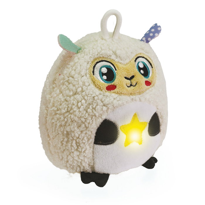 Todos los personajes de la línea Twinkle Twinkle se iluminan y activan melodías relajantes y sonidos blancos estudiados para ayudar al bebé a conciliar el sueño. La luz cálida ilumina el entorno que rodea al bebé, mientras que los sonidos y las melodías fomentan la relajación.
