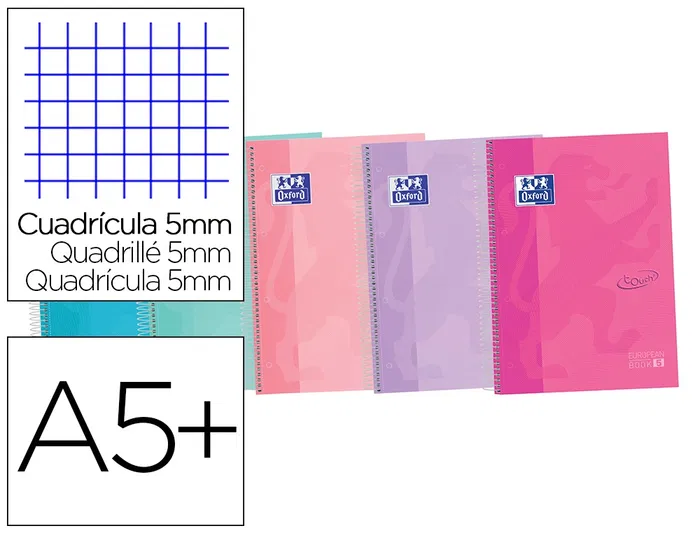 Oxford Cuaderno espiral Europeanbook 5 Touch Pastel A4+ Extradura 120 hojas cuadro 5 mm - Aplicación Scribzee, colores surtidos