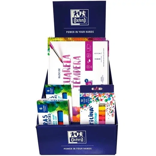 Contenido: 1. 400148232. BLOC ESPIRAL OXF DIBUJO A4+ 20H 130G LISO x 20 UNIDADES 2. 400148238. BLOC ESPIRAL OXFORD ACUARELA/TEMPERA A4+ 10H 300G LISO X 10 UNIDADES 3. 400175707. PLASTILINA OXF 12 COLORES 200G X 6 UNIDADES 4. 400175708. TEMPERAS OXF 6 COLORES 20 ML X 3 UNIDADES.