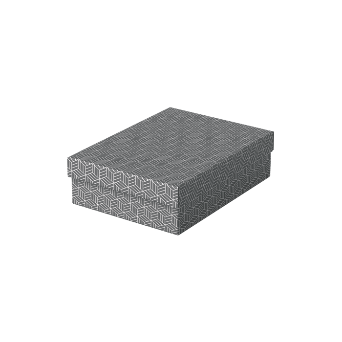 Juego de tres cajas de almacenamiento de cartón medianas con un diseño geométrico moderno y elegante.