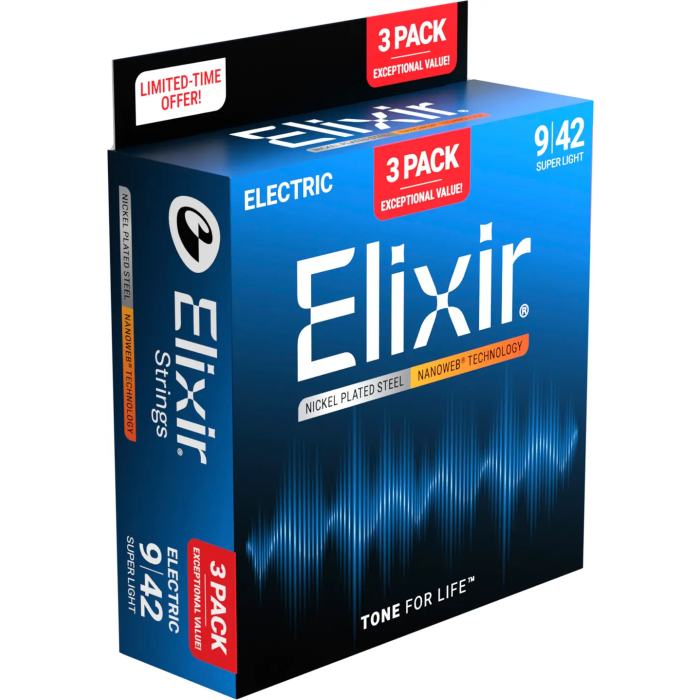 Elixir Pack 3 Cuerdas Guitarra Eléctrica Nanoweb Nickel Plated Steel Super Light 9-42