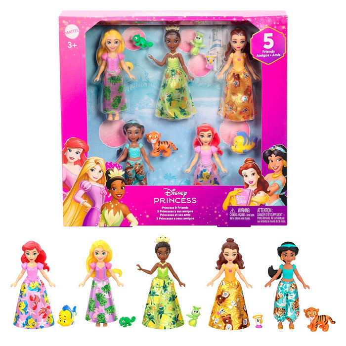 Con cinco muñecas pequeñas Disney Princesas y cinco figuras de amigos, este adorable conjunto de personajes es ideal para crear historias inspiradas en las películas de Disney. Incluye muñecas pequeñas articuladas (8,9cm) de Ariel, Tiana, Bella, Jasmine y Rapunzel. Cada muñeca lleva una falda o pantalones extraíbles con un estampado de amistad único. El conjunto también incluye cinco figuras de amigos, uno para cada princesa: Flounder (Ariel), Ray (Tiana), Chip (Bella), Rajah (Jasmine) y Pascal (Rapunzel).