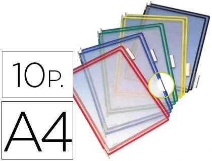 Fundas para documentos DIN A4 fáciles de insertar y extraer de los soportes. Bordes de color. Fabricadas en PVC antirreflejo, con pivotes metálicos para su inserción. Incluye índices indicadores de 50 mm. Apertura superior o lateral. Se fija a todos los soportes metálicos (de pared, de sobremesa, rotores...). El pack de 10 fundas.