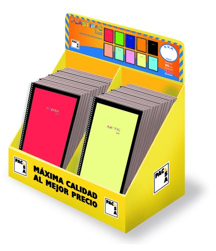 Bloc con cubierta y contracubierta extradura de polipropileno traslúcido, papel Extra de 100 gr/m² con rayado y margen, y espiral nylonizado blanco con coil-lock. Certificado PEFC. Expositor en colores vivos y pastel (20 unidades/color).
