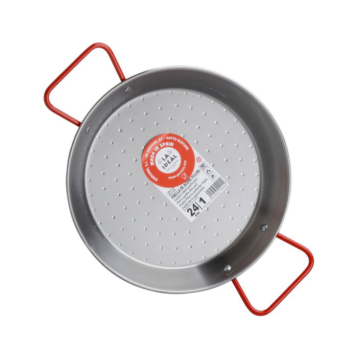 - Paella valenciana LA IDEAL de acero pulido con 2 asas rojas y 2 remaches de acero.
