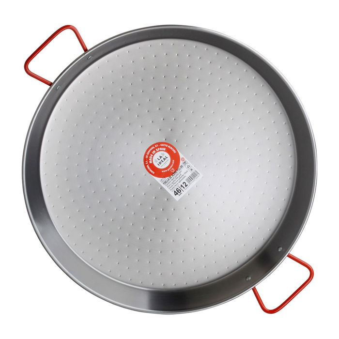 - Paella valenciana LA IDEAL de acero pulido con 2 asas rojas y 2 remaches de acero.