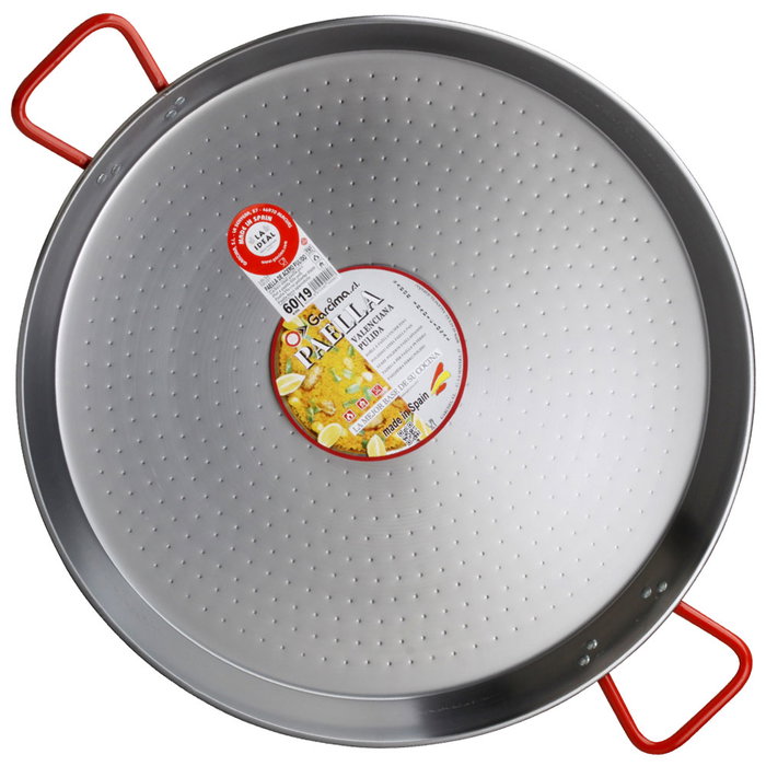 - Paella valenciana LA IDEAL de acero pulido con 2 asas rojas y 4 remaches de acero.