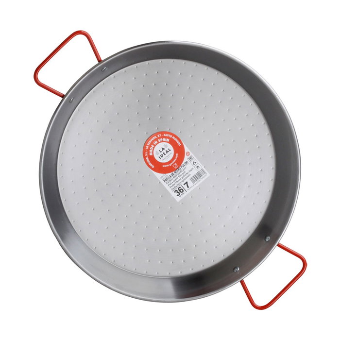 - Paella valenciana LA IDEAL de acero pulido con 2 asas rojas y 2 remaches de acero.