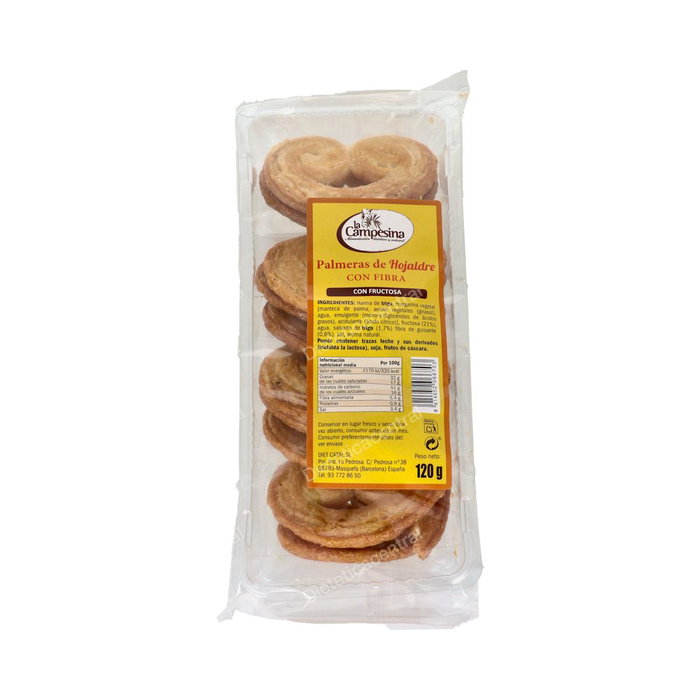 Indicaciones: Palmeras de hojaldre con fibras, sin azúcares añadidos, con edulcorantes.