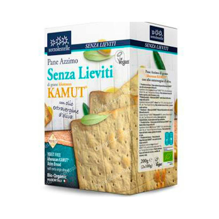 Indicaciones: Ligero y crujiente rectángulo de pan sin levadura preparado con pocos ingredientes genuinos como harina de trigo Khorasan, aceite de oliva extra virgen y sal. El término ázimo, del griego azymos, indica la ausencia de levaduras que lo hace apto también a quien sufre de intolerancia a las levaduras o a quien desea variar su propia alimentación.
