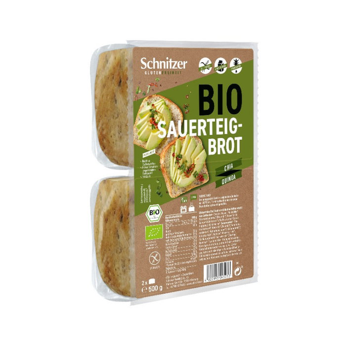 Agua, fécula de maíz*, masa fermentada de arroz* (harina de arroz*, agua), 8% harina integral de quinoa*, 4% chía (Salvia hispánica*), pipas de calabaza*, SÉSAMO*, aceite de girasol*, harina de maíz*, harina de arroz*, pipas de girasol*, cáscara de semilla de psyllium*, harina de linaza*, proteína de guisante*, dextrosa*, sal marina, levadura*, espesante: harina de guar*, xantano*, especias*.