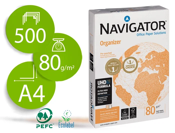 Troquelado con taladros para su posterior archivo y clasificación con las mismas características que el Navigator 80 g/m². Mantener el papel con su embalaje original hasta por lo menos 24 horas antes de su utilización. Trabajos a dos caras. Fotocopias a alto volumen. Impresión láser, ink-jet B/N y color. Uso apto en fax. Calidad garantizada por Soporcel. Hasta 200 años de vida de los archivos. Formato DIN A4.