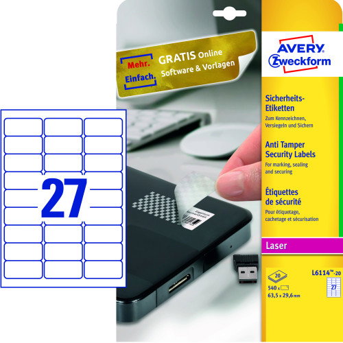 Avery Anti-tamper Label - Laser - L6114. Color del producto: Blanco, Tecnología de impresión: Laser. Hojas de medios por paquete: 20 hojas. Tamaño de medio (1 diapositiva): 63.5 x 29.6 mm