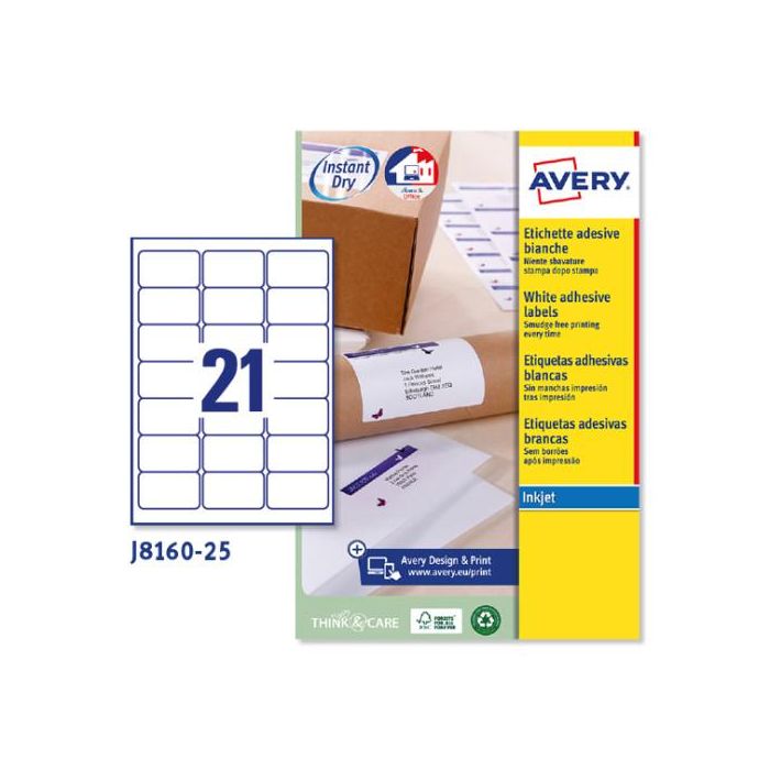 Avery J8160-25 Paquete 25 Hojas Etiquetas Blancas Quick Dry para Impresoras de Inyección de Tinta 63.5x38.1 MM