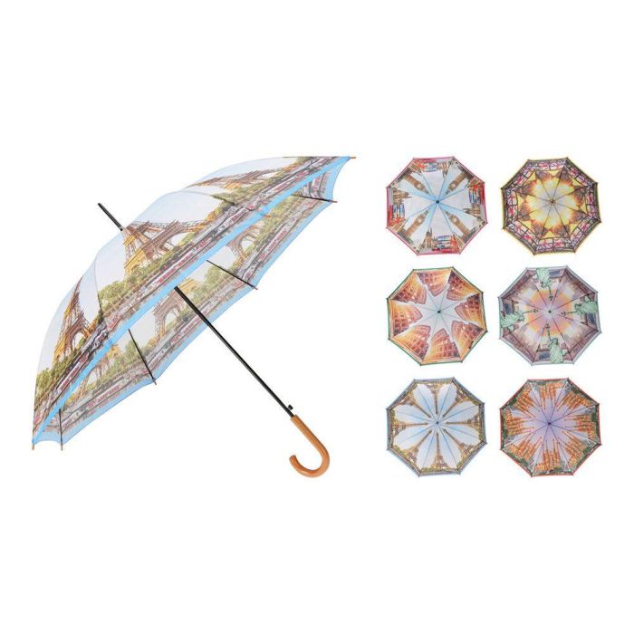 Basics - Paraguas Automático de Ciudades, 58,42 cm, 8 Varillas, Puño de Madera, Poliéster - 6 Modelos Surtidos (Amsterdam, Barcelona, Londres, Nueva York, París, Roma)