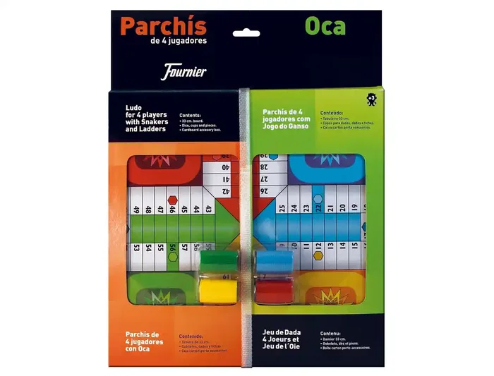 Juego de parchís para 4 jugadores con oca. Contiene: tablero, 4 cubiletes, 4 dados y fichas de 4 colores. Caja para guardar accesorios. Medidas: 330 x 330 mm.