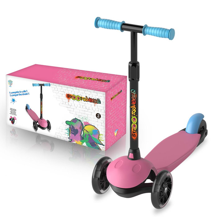 Patinete de 3 ruedas de diseño propio. Incluye: Barra de dirección de aluminio y ajustable en altura. Fácil montaje y desmontaje con un solo clic. Plegable y fácil de transportar a cualquier parte. Puños antideslizantes con punta redondeada (para evitar golpes. Plataforma con alta resistencia contra golpes e impactos. Ruedas n luces de led. Freno trasero que no se calienta ni desgasta la rueda Peso 1,9 kg. Dimensiones 68 cm alto, 53 cm largo, 23 cm ancho. Recomendado para niños entre 2-6 años.