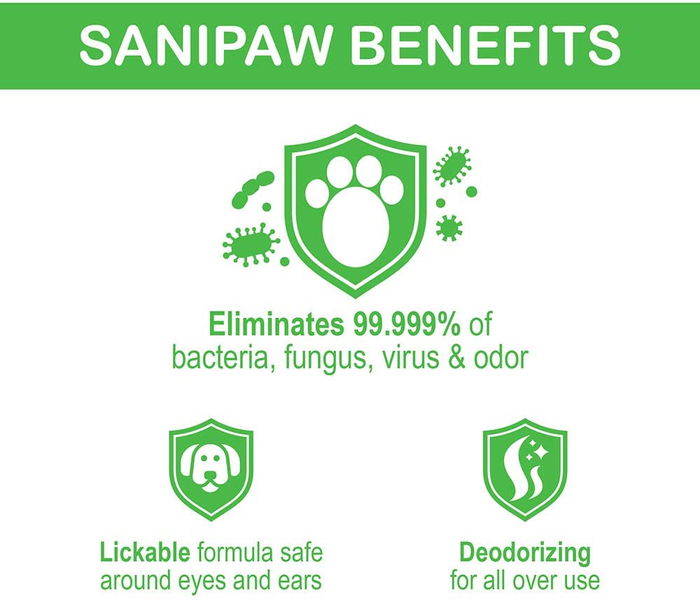 - Observaciones: Los perros pisan todo tipo de cosas repugnantes cuando están retozando y explorando afuera. Afortunadamente, ahora tiene herramientas para combatir la suciedad para proteger su hogar de las patas sucias y sucias. SaniPaw Spray contiene un agente desinfectante que se encuentra en los enjuagues bucales populares que elimina de forma segura el 99,999% de las bacterias, virus, hongos y olores al contacto. ¡Elimina la calle de los pies de su perro! ™ Un simple rociado después de cada paseo lo hace todo. Solución clara y sin perfume, hipoalergénico y sin alcohol. Seguro alrededor de ojos y oídos. Con glicerina, aloe vera y vitamina E para ayudar a que las almohadillas de las patas se mantengan flexibles y saludables. Ayuda a promover patas saludables todos los días del año.