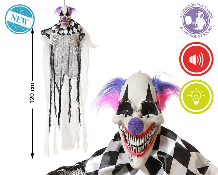 Decora tu fiesta con este impactante payaso arlequín colgante de 120 cm, que mezcla el terror con un diseño llamativo. sus colores contrastantes, junto con los efectos sonoros y de luz, lo convierten en una figura ideal para casas encantadas, eventos temáticos o locales de ocio. añade dramatismo y susto garantizado.