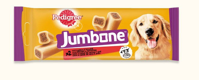 Los snacks Jumbone Medium, de Pedigree, están especialmente pensados para perros medianos. A diferencia de los huesos habituales, no se astillan, de manera que se los puedes dar a tu perro tranquilamente sin tener que preocuparte por que se astillen. Su textura exterior crujiente y su sabroso relleno encantarán a tu perro y le proporcionarán largos ratos de diversión.