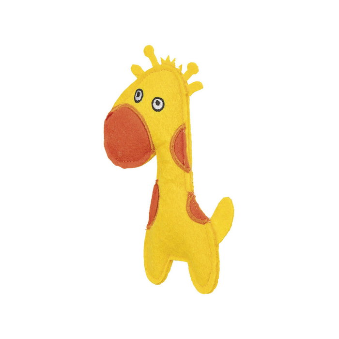 El peluche para perros de Trixie es un juguete blando y ligero diseñado específicamente para estimular el juego y el entretenimiento diario de su mascota, con forma de jirafa en color amarillo que llama la atención del perro y facilita su localización en casa. Fabricado en una combinación de fieltro y felpa, ofrece una textura suave y agradable al tacto que resulta cómoda para la boca del animal, ayudando a proteger dientes y encías frente a materiales más duros. Su tamaño aproximado de 15 cm lo hace adecuado para perros de tamaños pequeños y medianos, fácil de coger, transportar y sacudir, favoreciendo el desarrollo del instinto de juego y la actividad física moderada. La estructura mullida del peluche permite que el perro lo use tanto para juegos interactivos con el cuidador como para momentos de entretenimiento en solitario, ayudando a reducir el aburrimiento. Algunos modelos de este tipo de peluches incluyen catnip, lo que puede aumentar el interés de ciertas mascotas y añadir estímulo olfativo, si bien su presencia no modifica la función principal como juguete de compañía. Este peluche para perros Trixie de fieltro y felpa es una opción sencilla y funcional para complementar el enriquecimiento ambiental y la rutina de juego de su perro.