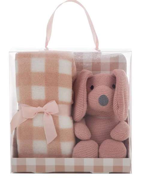 SET CAJA MANTA CUADROS 90 X75 CM ROSA PALO + PERRO 26 CM