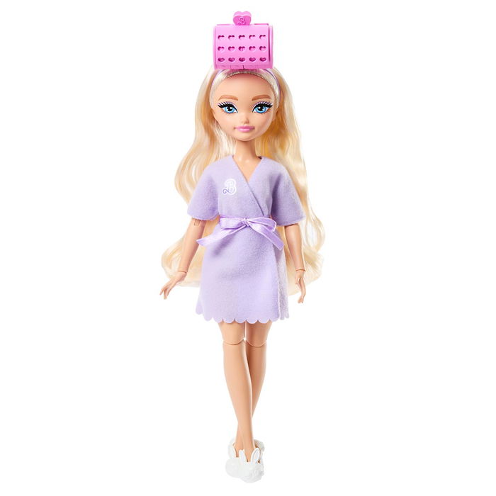 Las muñecas Barbie 'Malibu' y 'Brooklyn' GET READY WITH BARBIE, de la colección Dream Besties, animan a los niños y niñas a expresar cómo se sienten a través de la diversión de la moda y el maquillaje. Abre los rulos para encontrar diferentes accesorios de estilismo, como una tiza para el pelo y un lazo enorme. La muñeca articulada incluye prendas de quita y pon, como un batín, una mascarilla de pepino para los ojos, un vestido brillante y unos tacones. Barbie tiene una larga melena para que te diviertas peinándola. Dale estilo con lazos y pinzas para el pelo, e incluso añádele tiza. El peinado y el maquillaje de Barbie están listos. Ayúdala a ponerse su vestido brillante y completa su look con diferentes accesorios, como un teléfono, un anillo de luz y joyas.