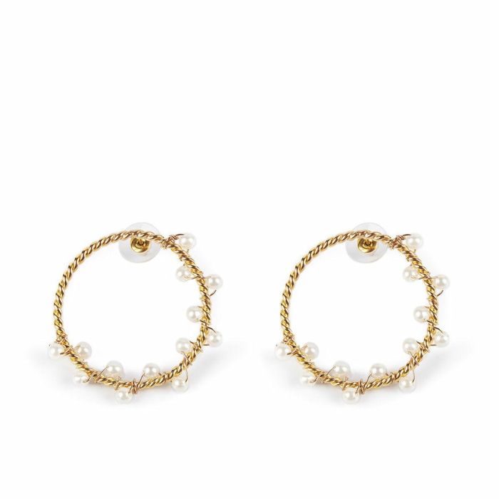 El diseño se distingue por su originalidad: un aro trenzado de 4 cm de diámetro, adornado con perlas delicadamente engarzadas. Un sutil bordado con hilo dorado asegura cada perla, añadiendo un toque de refinamiento.