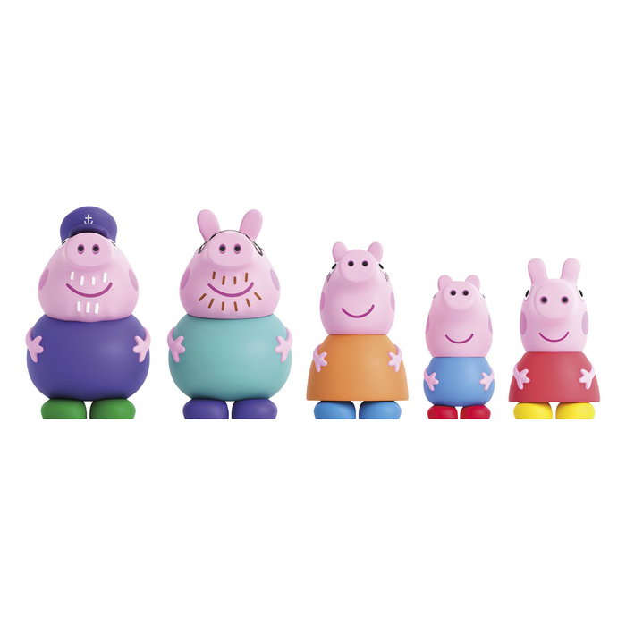 Pack de 5 figuras para el baño. Incluye los personajes de Peppa, George, Mamapig, Papapig y AbueloPig. Las figuras tienen un tamaño entre 7 y 10cm. Son de goma y poseen una apertura para que salga el agia y el aire y evitar que aparezca moho. Recomendado para mayores de 12 meses.