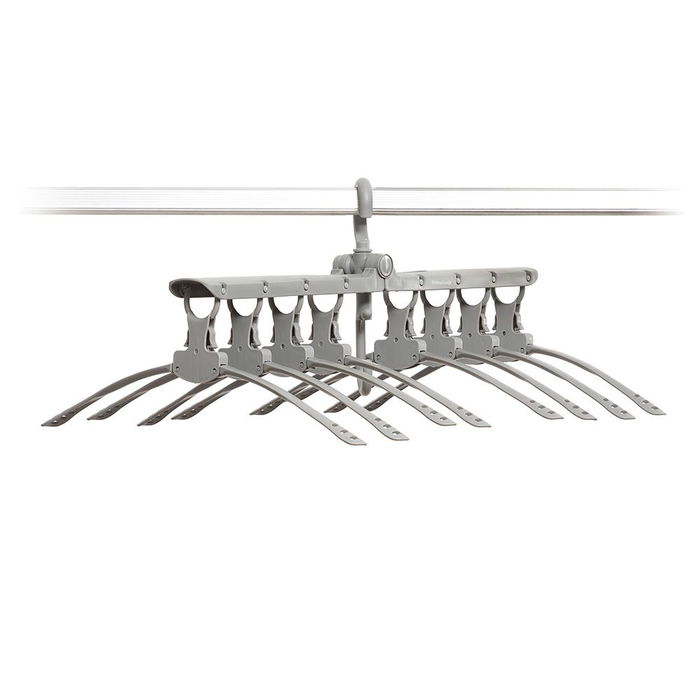 Colgador de ropa múltiple gris, 8 perchas unidas. puede colocarse en varias posiciones (horizontal o vertical). los brazos de cada percha se pliegan para colgar y descolgar las prendas con mayor facilidad. gancho colgador giratorio 360°. no apto para abrigos o prendas pesadas. incluye instrucciones de montaje. medidas desplegado: 41 x 13 x 52 cm (h) 41 x 16 x 5 cm (v).