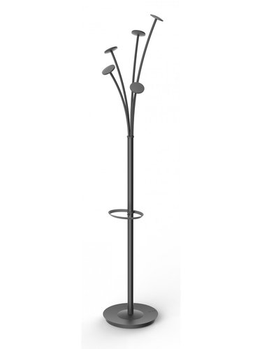 Perchero de pie con base de gran estabilidad, 5 ganchos grandes y soporte para guardar paraguas. La base de metal está equipada con un recipiente para la retención del agua. Un complemento de oficina para montar en menos de 5 minutos sin necesidad de herramientas, con un tamaño de 355 x 1870 mm.