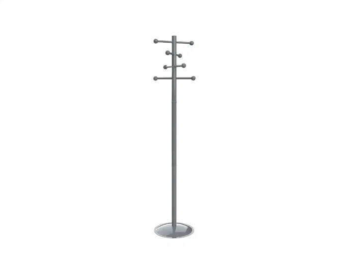 Diseño estable y compacto. Las barras para la ropa escalonadas con cabezales redondeados distribuyen la carga y permiten un acceso cómodo. Las barras metálicas para la ropa se asientan firmemente en su sitio. Resistente columna maciza de metal para un apoyo seguro. La placa base de acero macizo de gran diámetro garantiza una estabilidad perfecta. Las cabezas redondeadas de plástico no dañan la ropa. Ideal y compacto para zonas de entrada, oficinas o el hogar. Se adapta discretamente a cualquier área. Poste Ø 4 cm. 8 ganchos de metal para abrigos. Base Ø 36 cm, peso 2,5 kg. Color RAL 7001. Rápido y fácil de montar. Reciclable: desarmar y reciclar.