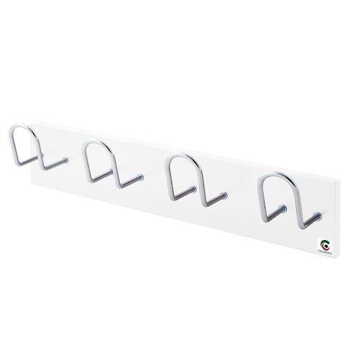 Percha de pared metálica con cuatro colgadores cromados, con aplicación electrostática de resina de poliéster de 60 micras de espesor. Fabricado en chapa blanca y laminada en frío, con calidad AP02, varilla del colgador F212 calibrado redondo con diámetro 7 mm. Medidas: 100 x 500 mm.