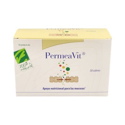 Indicaciones: PermeaVit 30 sobres es un complemento alimenticio que tiene una combinación única de vitaminas, minerales, aminoácidos y antioxidantes. La vitamina B2, la vitamina A y la biotina son importantes para el mantenimiento de las mucosas, incluida la intestinal. Las vitaminas D, B6 y B9 ayudan a mantener un sistema inmunológico normal. El zinc es esencial para un metabolismo normal de los macronutrientes y junto con la vitamina B2, contribuye a proteger las células frente al daño oxidativo. Además, PermeaVit contiene aminoácidos esenciales y no esenciales como L-lisina, L-glutamina y acetil-L-cisteína, siendo la L-glutamina un aminoácido clave que cumple funciones importantes en el organismo. También incluye quercetina con la tecnología Phytosome® que ayuda a mejorar su absorción y biodisponibilidad. Por último, contiene gamma orizanol obtenido a partir del salvado de arroz.