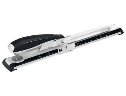 Grapadora de brazo largo de plástico con carcasa de metal, profundidad de inserción de papel de hasta 307 mm (regulable) y barra guía para ajustar formatos desde A6 a A2, US y folio. Utiliza grapas 22/6-8, 24/6-8 o 26/6-8 para un grapado preciso de hasta 40 hojas de papel de 80 gramos gracias a la tecnología de impacto directo. Una grapadora resistente para folletos.