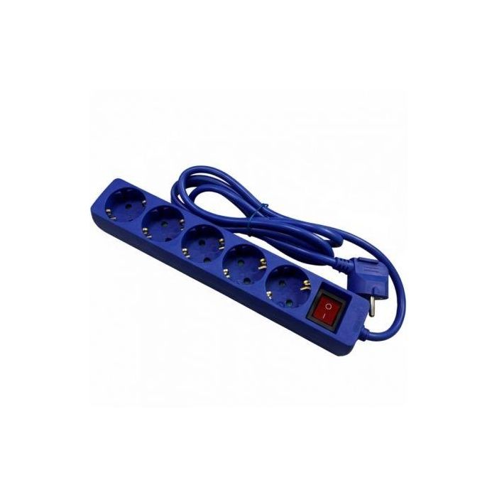Regleta PHASAK 5 tomas Schuko (CEE 7/7) con interruptor, cable 1,8 m, 16 A / 3680 W. Color azul, 3 conductores. Fabricada en plástico (PVC) resistente.
