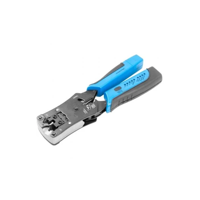 PHASAK TD 018 – Crimpadora con tester de red. Alicate profesional para conectores RJ11 / RJ12 / RJ45 que integra pelacables, cortador y un tester LED para verificación inmediata del cableado. Solución compacta y eficiente para montaje y mantenimiento de redes.