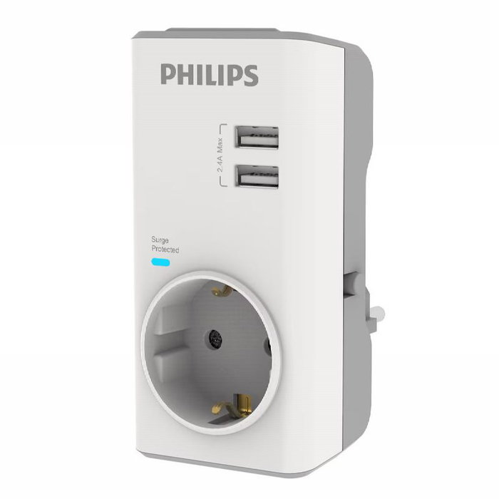 Adaptador de enchufe SCHUKO Philips con 2 puertos USB y protección contra sobretensiones. Protege tus dispositivos electrónicos de picos de voltaje mientras los cargas de manera eficiente.