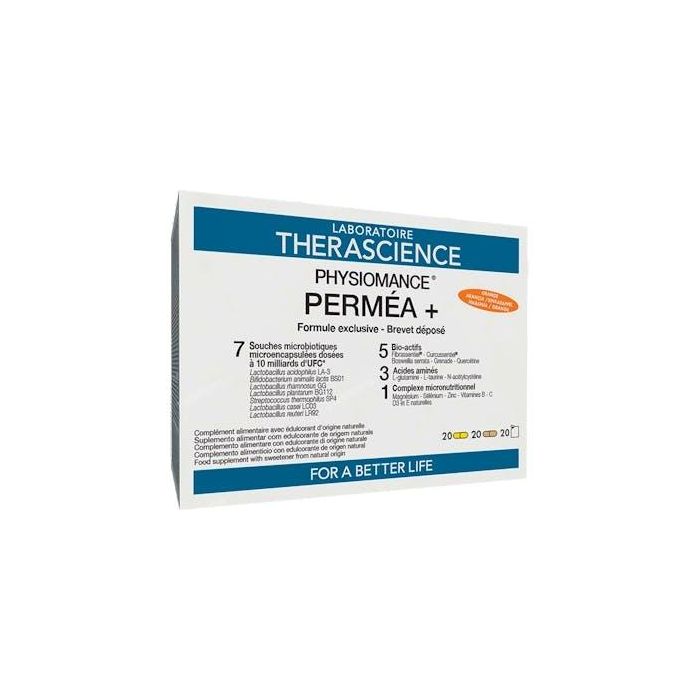 Indicaciones: Aporte de Boswelia Serrata, cúrcuma, zinc, L glutamina junto con probióticos para apoyar la normal función de barrera de la pared intestinal. Physiomance Permea +, de la marca Therascience, es un suplemento alimenticio que contiene una combinación única de ingredientes naturales que pueden ser de apoyo para el normal desempeño de la función intestinal. Entre ellos, se destaca la Boswelia Serrata, reconocida por sus propiedades antiinflamatorias, y la cúrcuma, un antioxidante con propiedades antiinflamatorias. Además, el suplemento contiene zinc, L-glutamina y otros componentes que trabajan en conjunto con los probióticos reparadores y antiinflamatorios pueden ayudar a mantener la normal función de barrera de la pared intestinal. El producto puede ser útil en situaciones de alteraciones intestinales. Gracias a su fórmula única y natural, este suplemento es una opción para aquellas personas que buscan ayudar a su sistema digestivo de forma segura y efectiva, sin recurrir a medicamentos sintéticos.