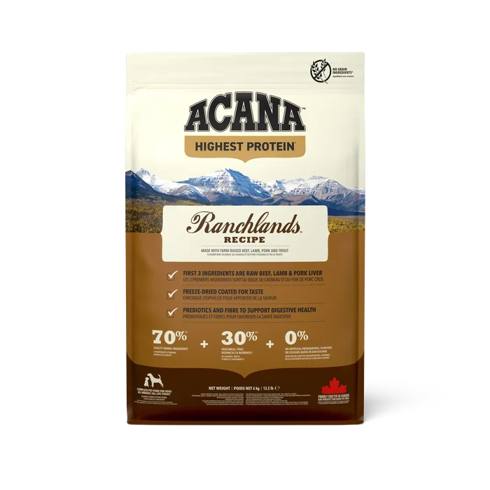 Acana Canine Adult Regionals Ranchlands Prairie es un alimento para perros adultos, completo y de alta calidad. Esta receta está formulada con ingredientes frescos y regionales, representando el compromiso de la marca Acana con la nutrición biológicamente apropiada.
