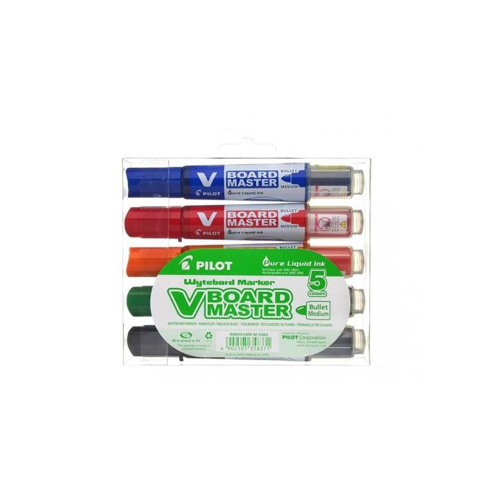 Pilot WBMA-VBM-M-S5-BG Marcador V-Board Master, Punta Redonda, Negro, Azul, Verde, Naranja, Rojo - Paquete de 5