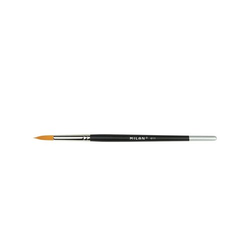 Pincel redondo con mango corto de madera barnizado en color negro, virola niquelada y pelo sintético de 18,8 mm (pincel de 183 mm de largo). Un accesorio de pintura para técnicas húmedas y acuarelas.